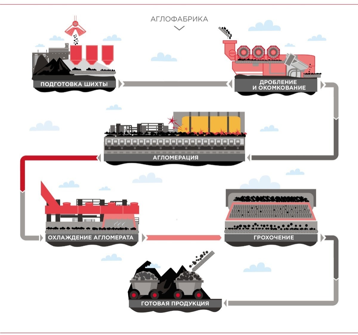 На порозі кухні металургів нас зустрічає агломераційна фабрика. Тут завершується підготовка залізорудної сировини до виробництва чавуну – виготовляється агломерат. На фабриці є місце для зберігання всіх інгредієнтів, техніка для подрібнення та приготування – цехи з приймання сировини, її обробки й відвантаження готової продукції.