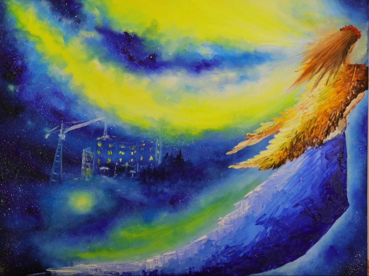 Серед космічних картин є сюжети про жителів планети А, які потрапили на Землю, і тут їх стали називати аутистами. Максим ще й книжку про них пише. Картина в зелено-помаранчевих тонах із жителями А в образі янголів «Наш світ на планеті Земля» так сподобалась Олександру Мироненку, що він вирішив її придбати. Гроші від продажу картини Kosmo Maks спрямує на допомогу ЗСУ.
