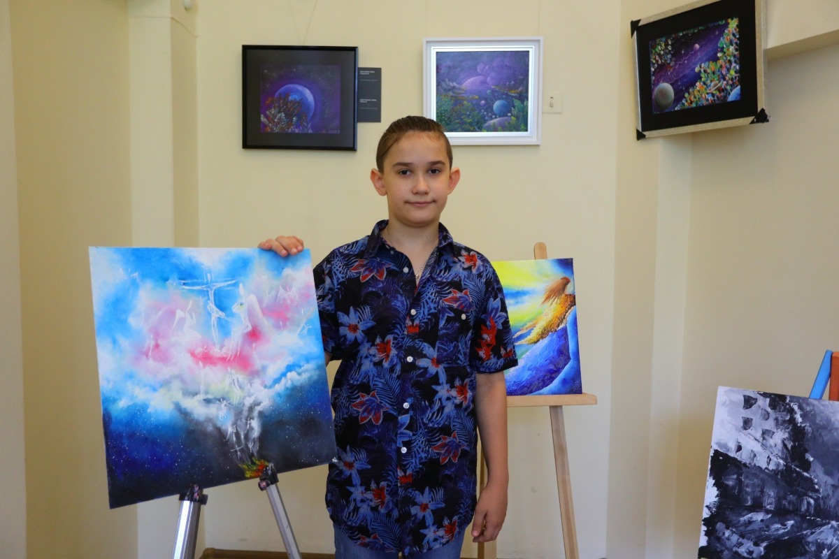 Максим розповів про деякі роботи на виставці. Він слідкує за новинами та малює події, які його вражають. Так, сповнену болю картину «Маріуполь» юний художник намалював за пів години. Причому, у хлопчика тоді була зламана права рука, тож він уперше малював лівою рукою. Вразили його й трагічні події в Оленівці.