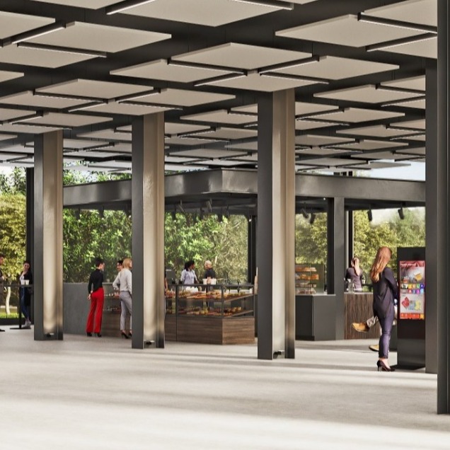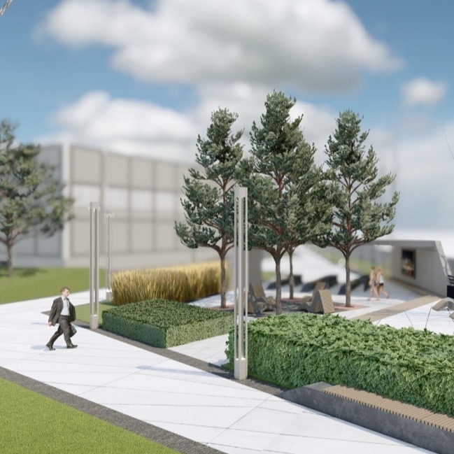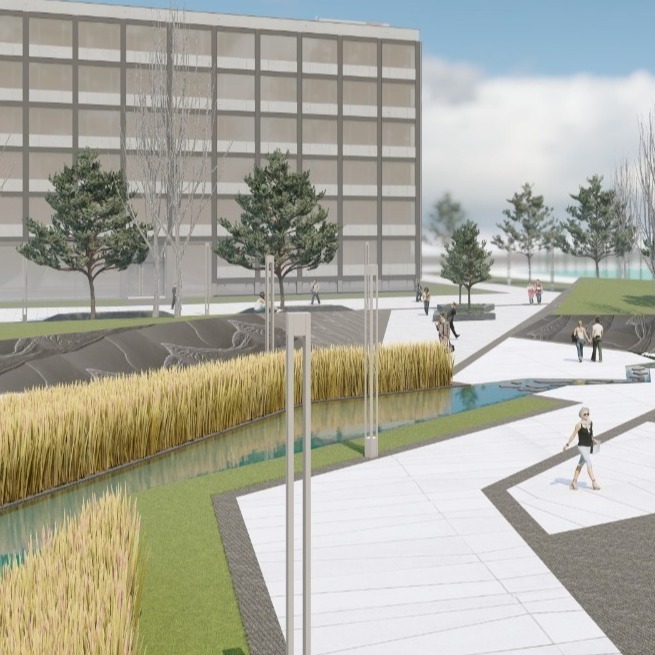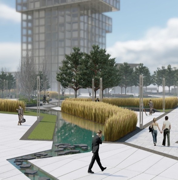 Багато місця відведено під зелені насадження. Це має створити відчуття острівця природи серед міського шуму. Дерева й кущі мають доповнювати територію кампуса, врівноважуючи сталеву конструкцію будівель «зеленими акцентами».