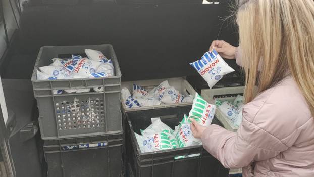 Співробітники Північного ГЗК передають переселенцям молочну продукцію