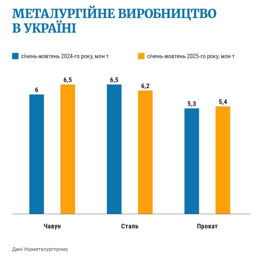 За 10 місяців 2025 року українська металургія виробила 6,2 млн т сталі. Наступного року, за прогнозами «ГМК Центру», Україна може виплавити 6,7‑7 млн т сталі. Близько 55 % української сталевої продукції експортується на тлі того, що внутрішній ринок не має потенціалу до зростання під час війни. Надмірне виробництво сталі в Китаї призвело до зростання експорту з цієї країни, що спричинило падіння цін на глобальному ринку та звуження можливої географії експорту з України.