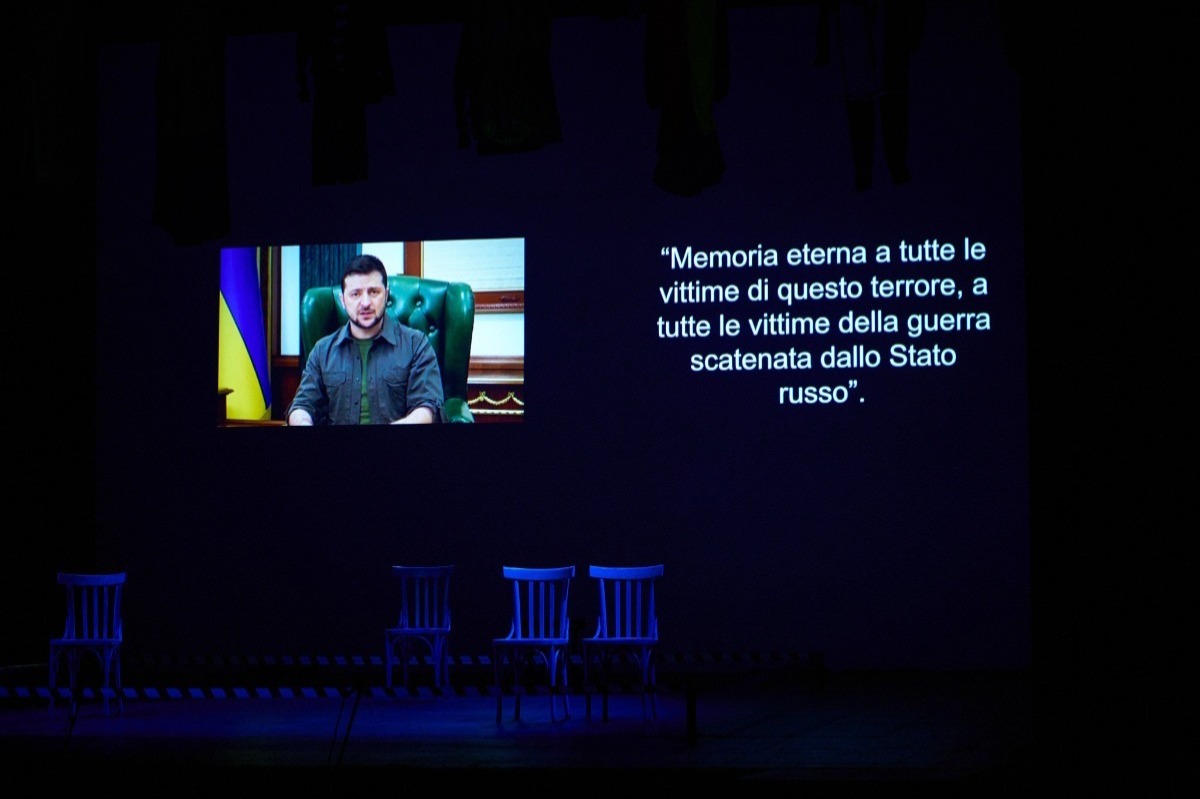 Напередодні четвертої річниці повномасштабного вторгнення Росії в Україну, театр Дузе в Генуї показав виставу «Маріупольська драма», засновану на реальних свідченнях тих, хто вижив після бомбардування Маріупольського драматичного театру під час облоги міста в березні 2022 року.